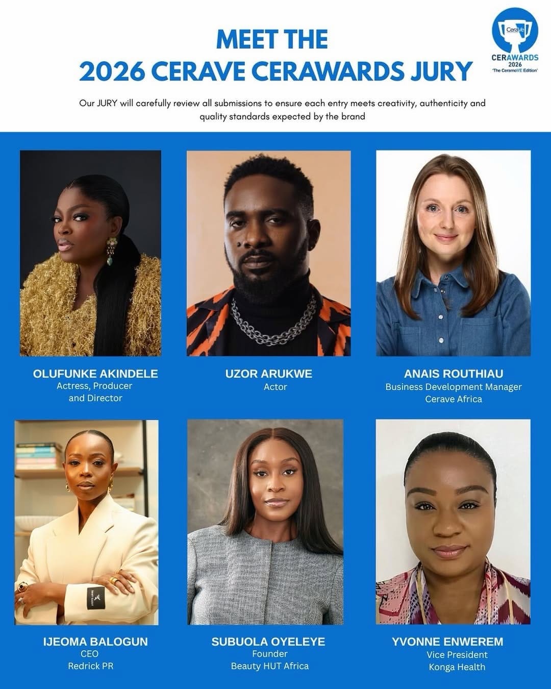Entries will be assessed by a jury drawn from film, media, beauty, and business. The panel includes actress, producer, and director Funke Akindele; actor Uzor Arukwe; Anais Routhiau, Business Development Manager at CeraVe Africa; Ijeoma Balogun, CEO of Redrick PR; Subuola Oyeleye, Founder of Beauty Hut Africa; and Yvonne Enwerem, VP at Konga Health. Judging criteria cover creativity, performance, originality, and execution.